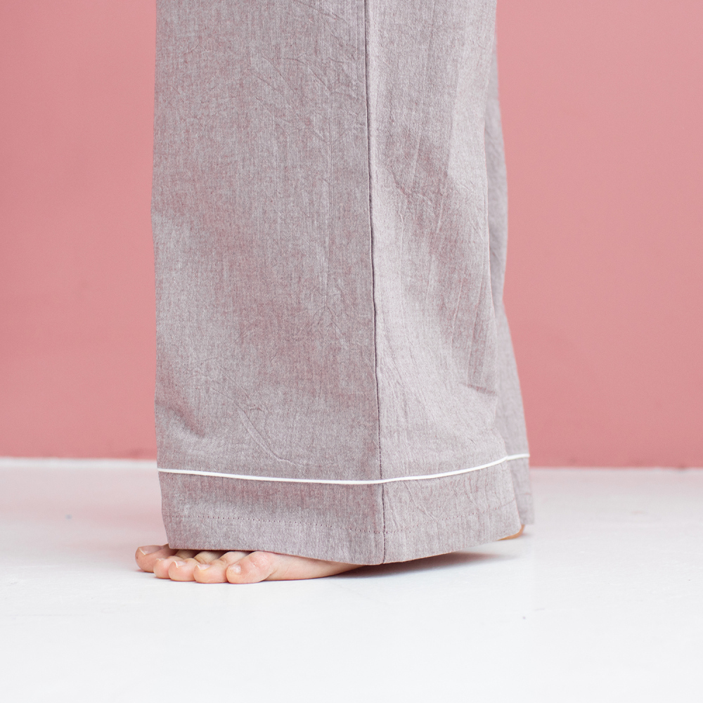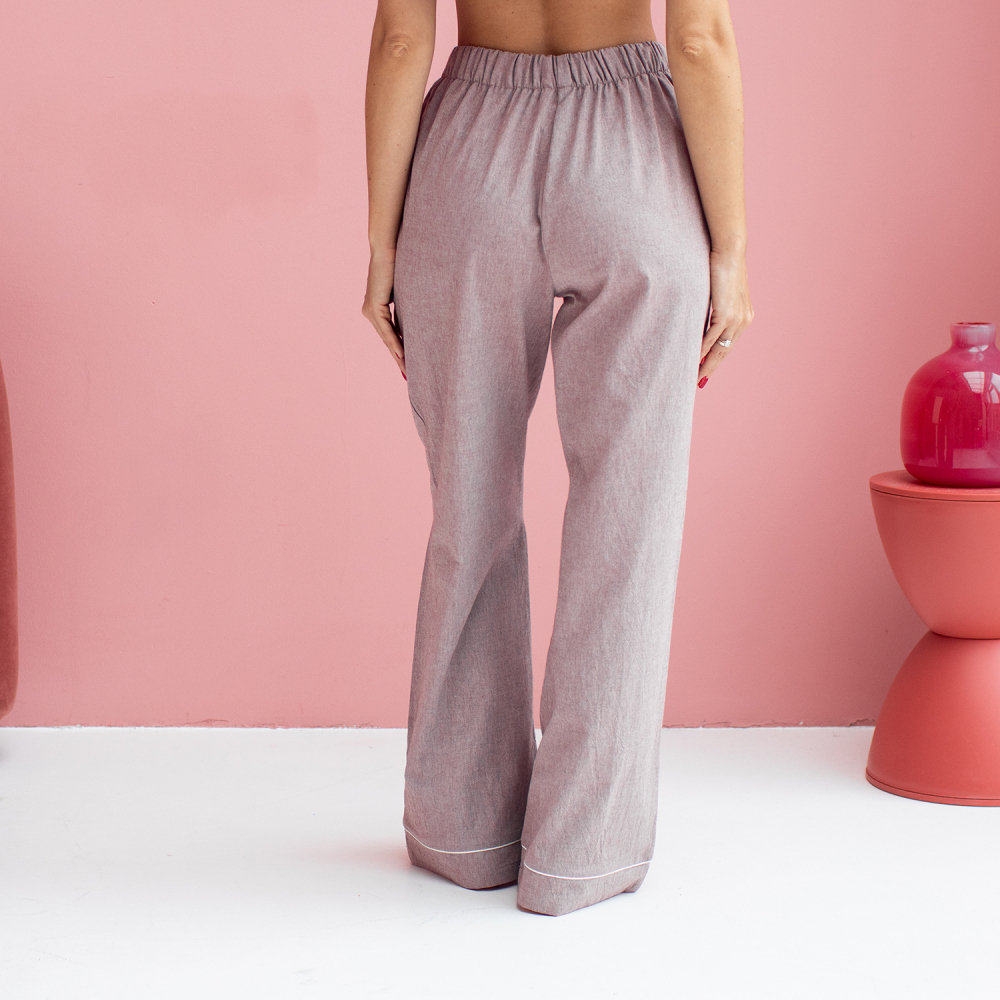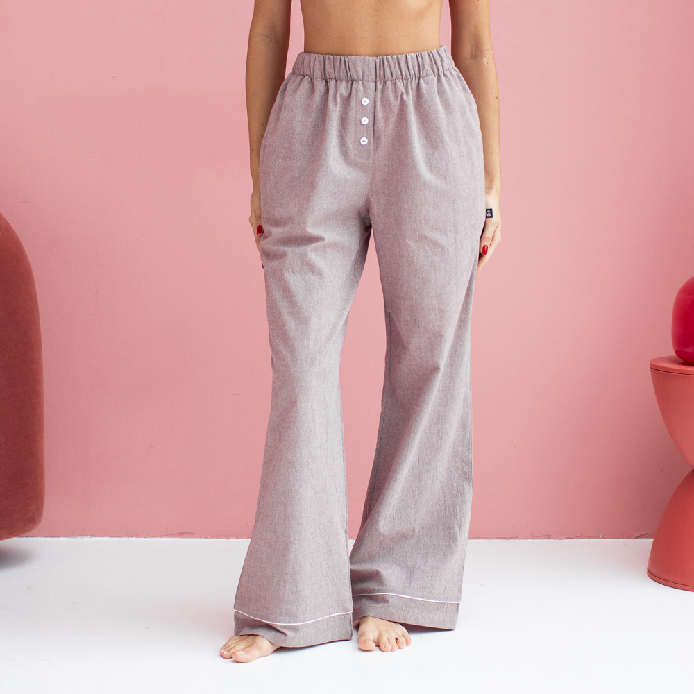 Брюки из  из вареного хлопка на резинке, декорированные контрастными пуговицами и кантом.