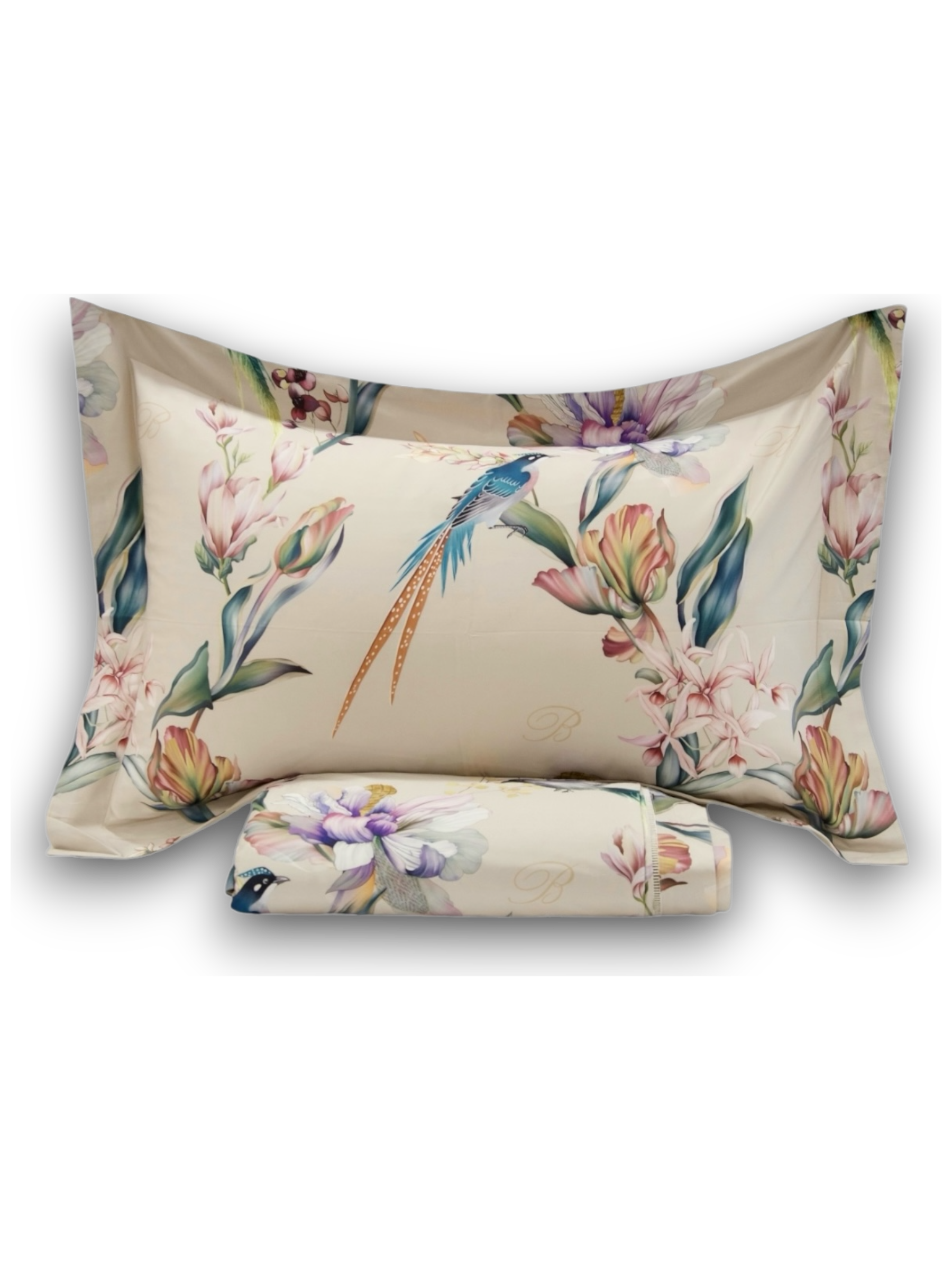Постельное белье Blumarine в размере евро. Комплект из сатина-люкс (египетский хлопок). Гармоничная комбинация нежного цветочного принта и шелковистой однотонного полотна простыни.