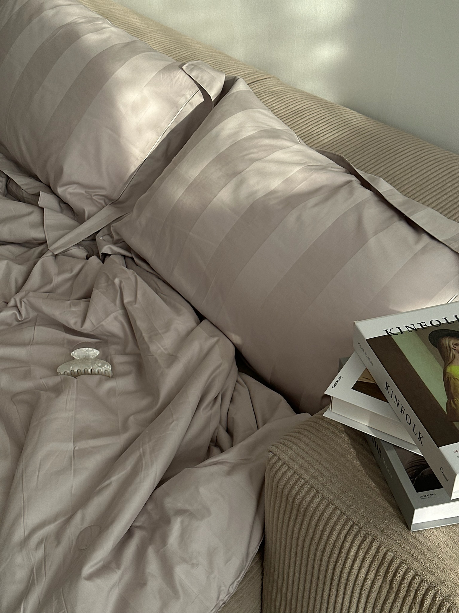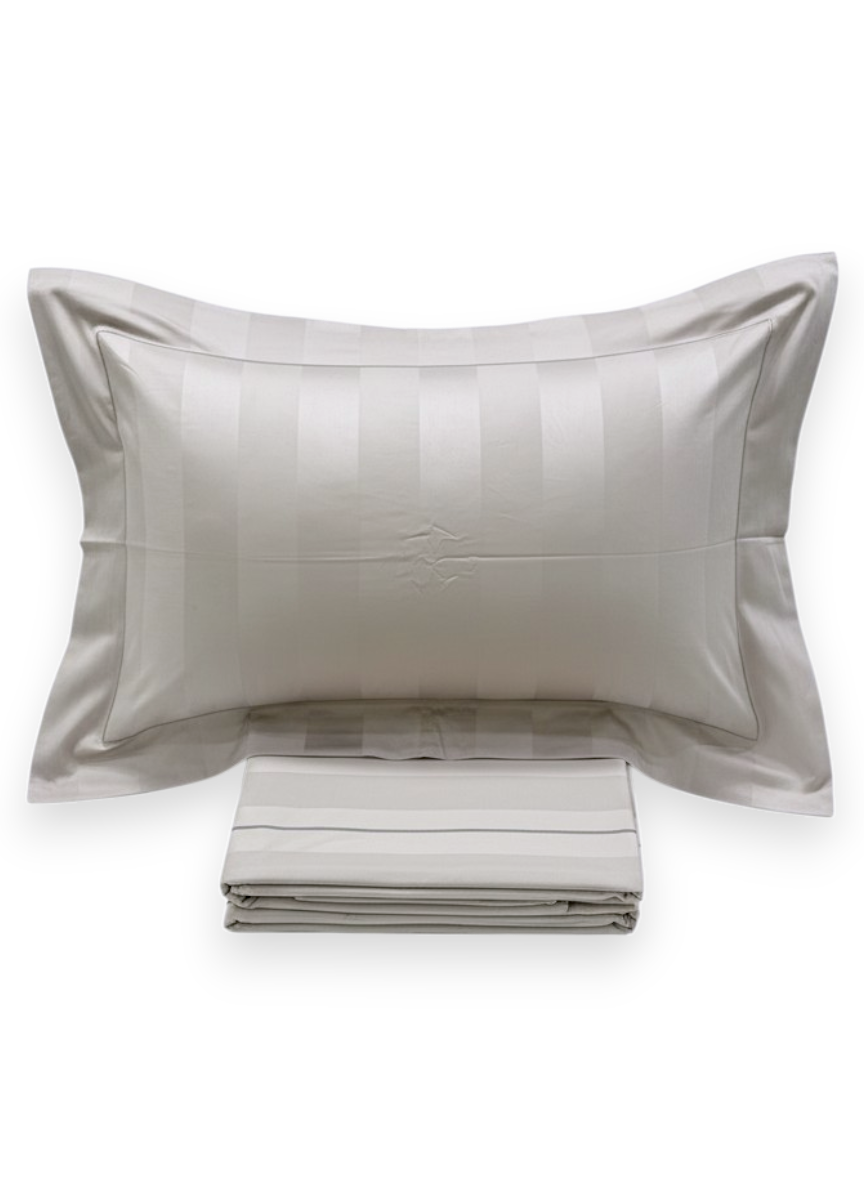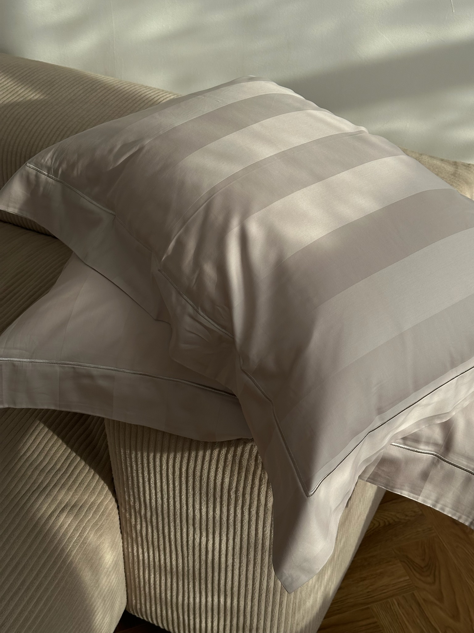 Базовый комплект постельного белья из сатина премиум-качества. Минималистичный дизайн с жаккардовыми узорами. Однотонная простынь с сатиновым финишем. Наволочки «оксфорд», пододеяльник на пуговках.