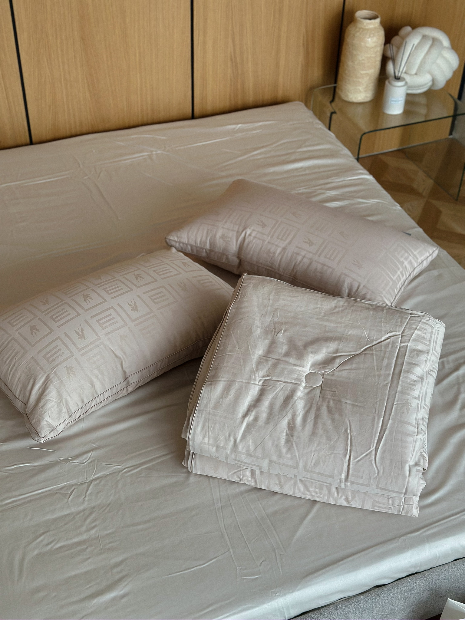 Комплект постельного белья из натуральной однотонной ткани. В комплект входят наволочки и пододеяльник на пуговицах.