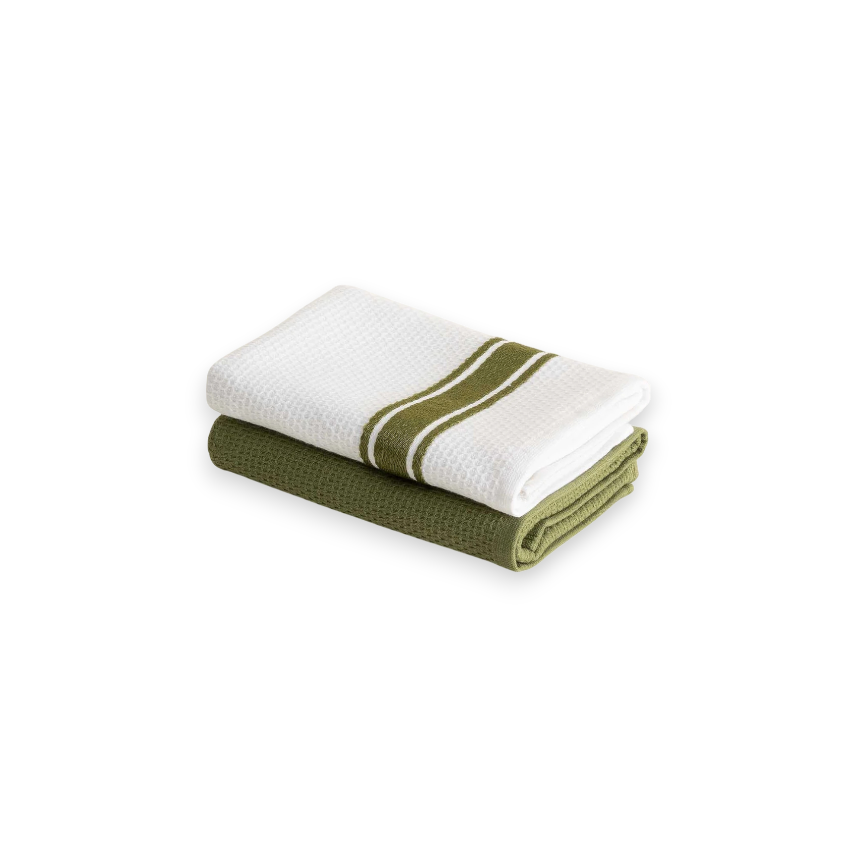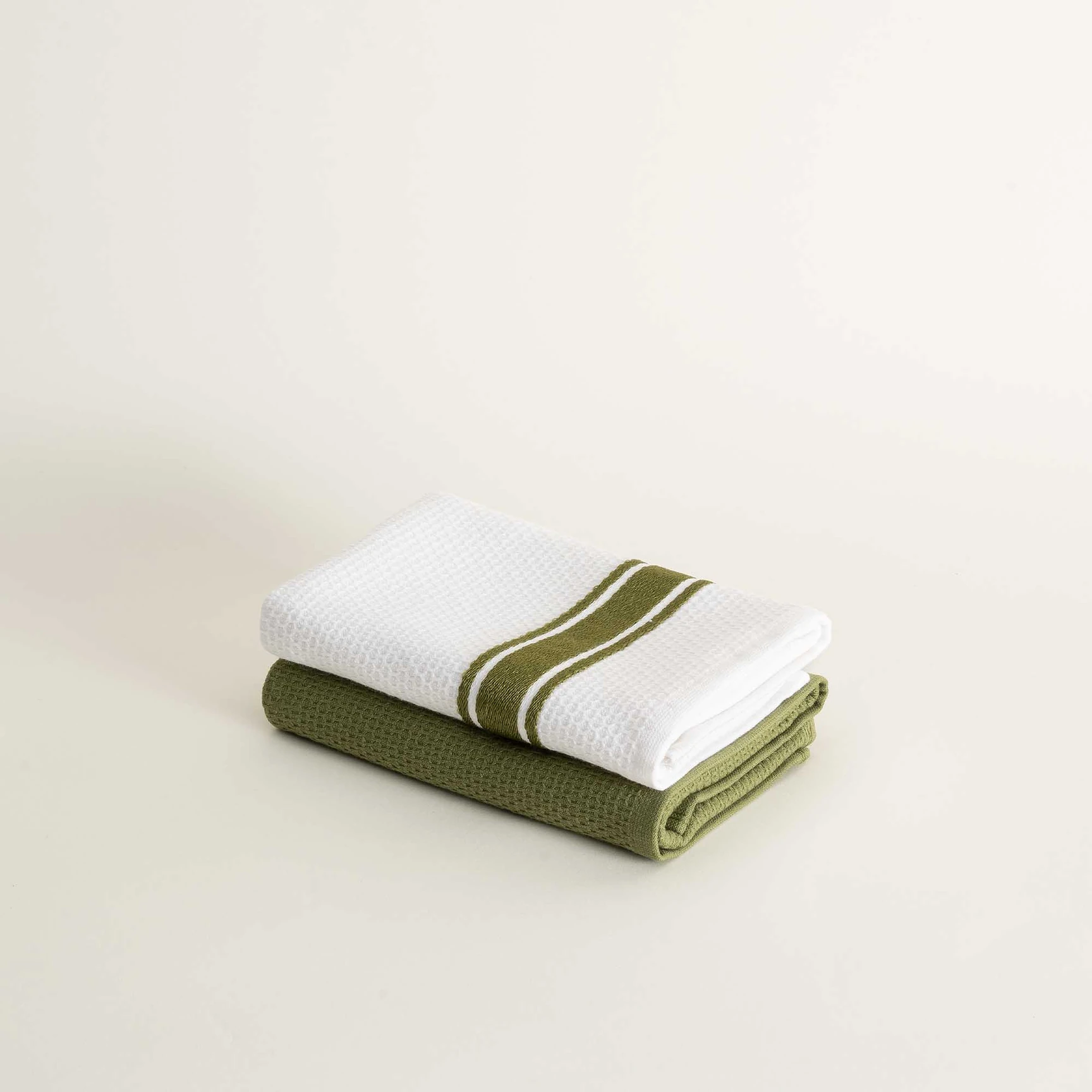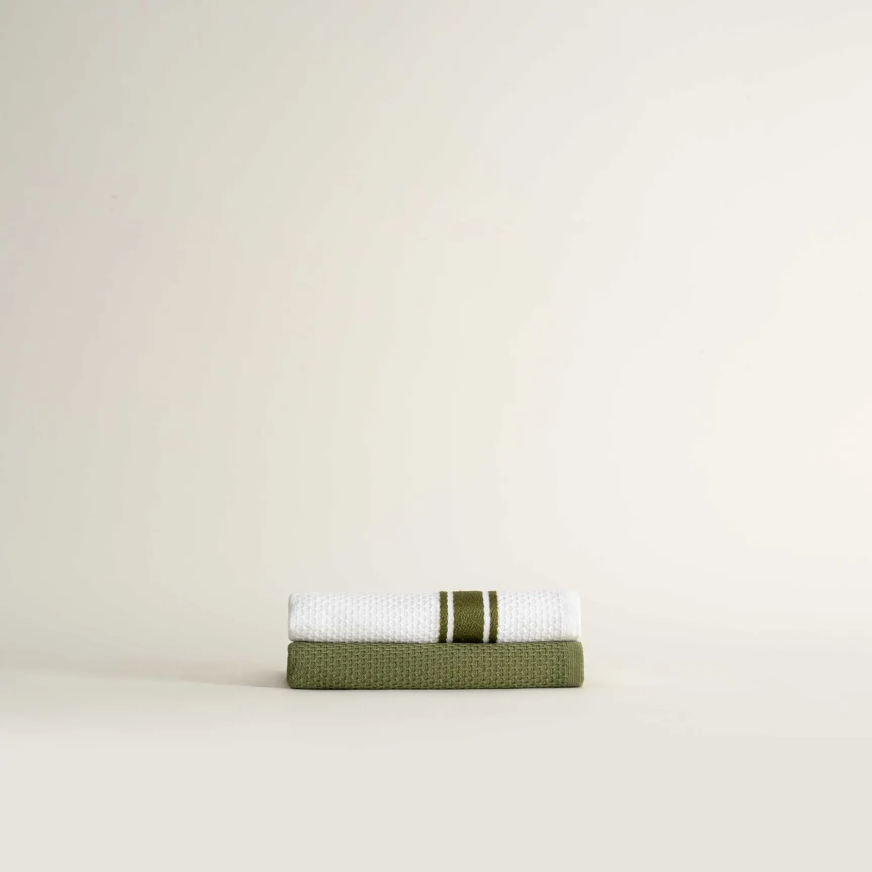 Набор двух кухонных полотенец из органического хлопка с петелкой. Плотный махровый хлопок отлично впитывает влагу и не меняет своих свойств после многочисленных стирок.