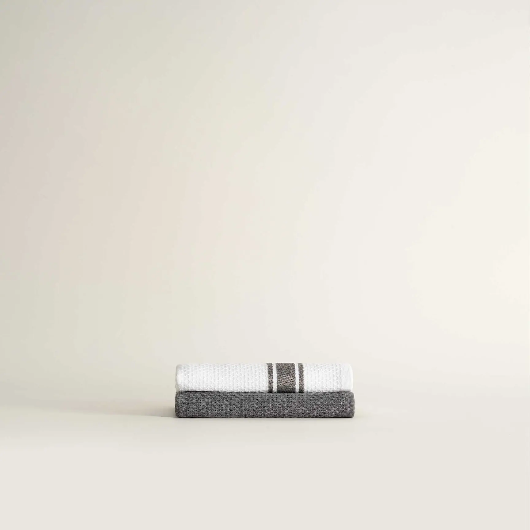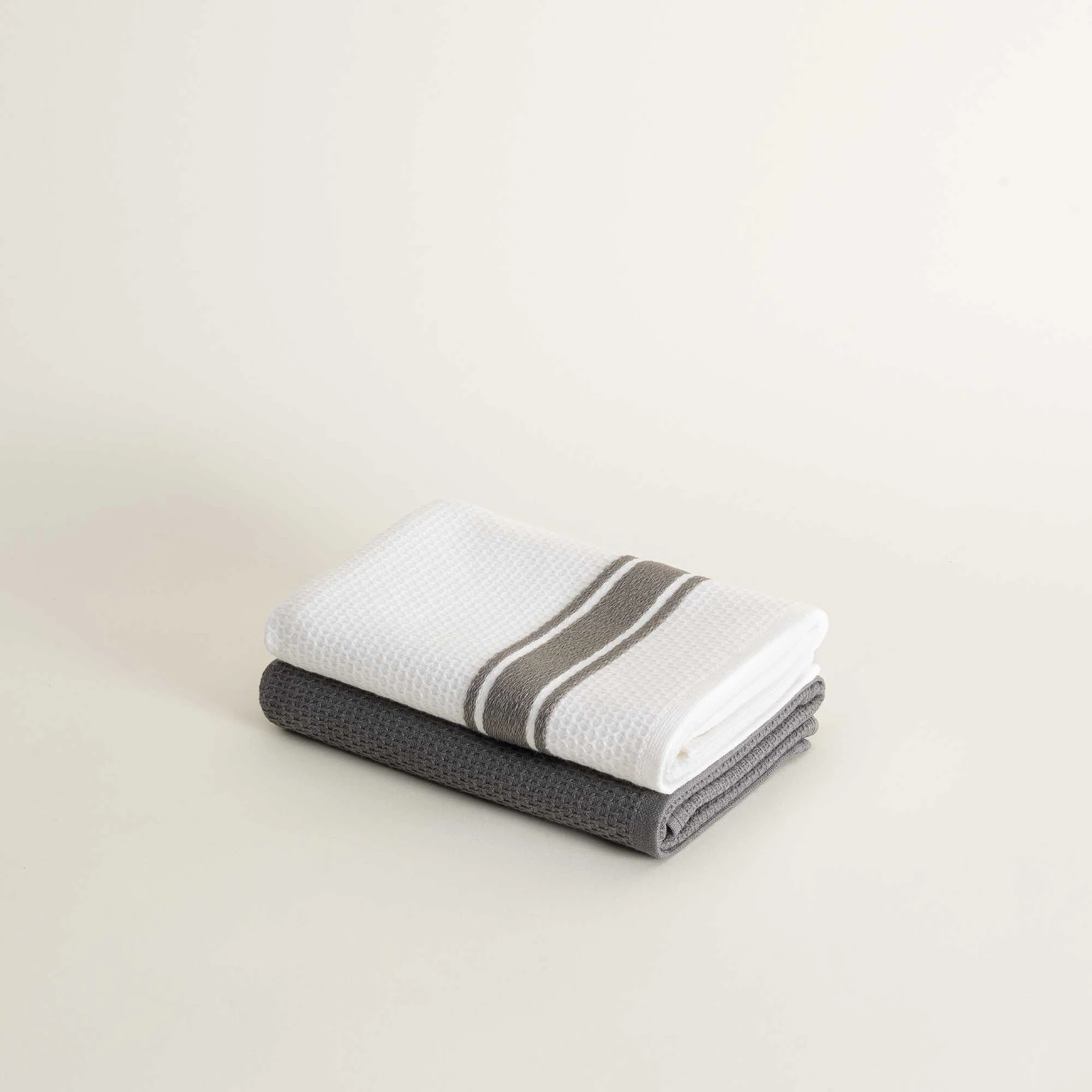 Набор двух кухонных полотенец из органического хлопка с петелкой. Плотный махровый хлопок отлично впитывает влагу и не меняет своих свойств после многочисленных стирок.
