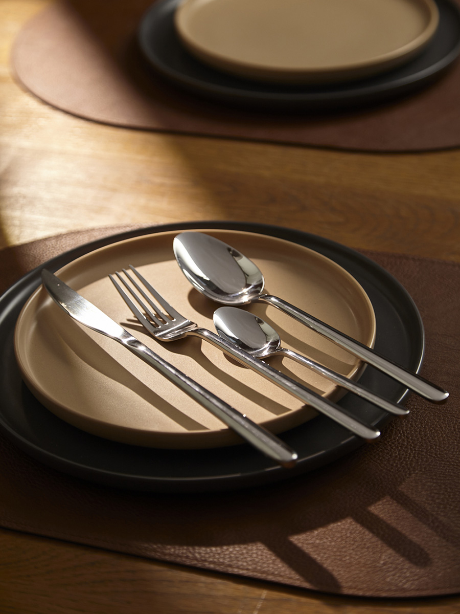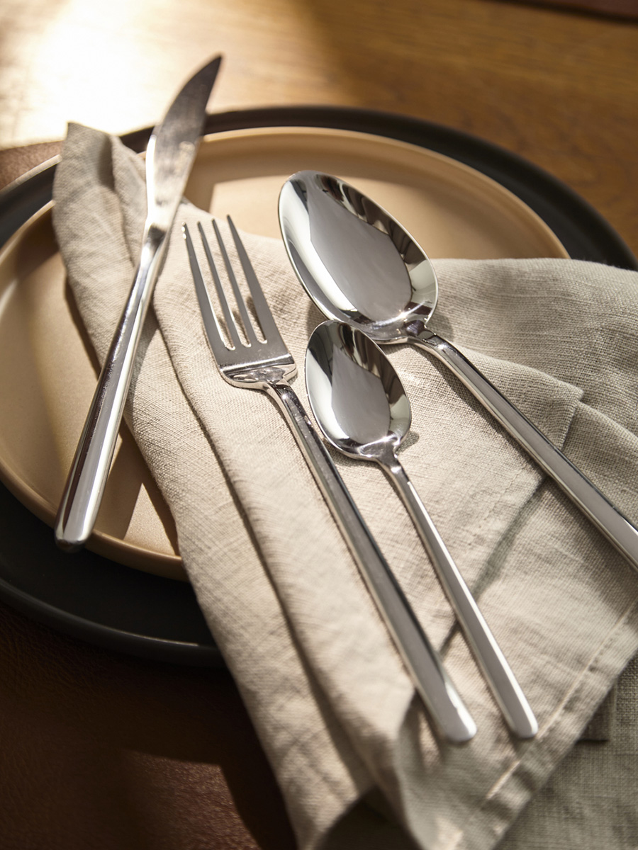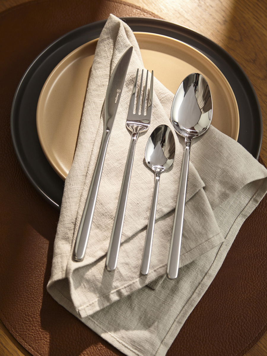 - Столовые приборы серебристого цвета с зеркальной полировкой идеально вписываются в классическую и традиционную сервировку, прекрасно сочетаясь с белоснежной скатертью и фарфоровой посудой. В современных решениях они могут служить ярким акцентом на фоне простых и лаконичных элементов.