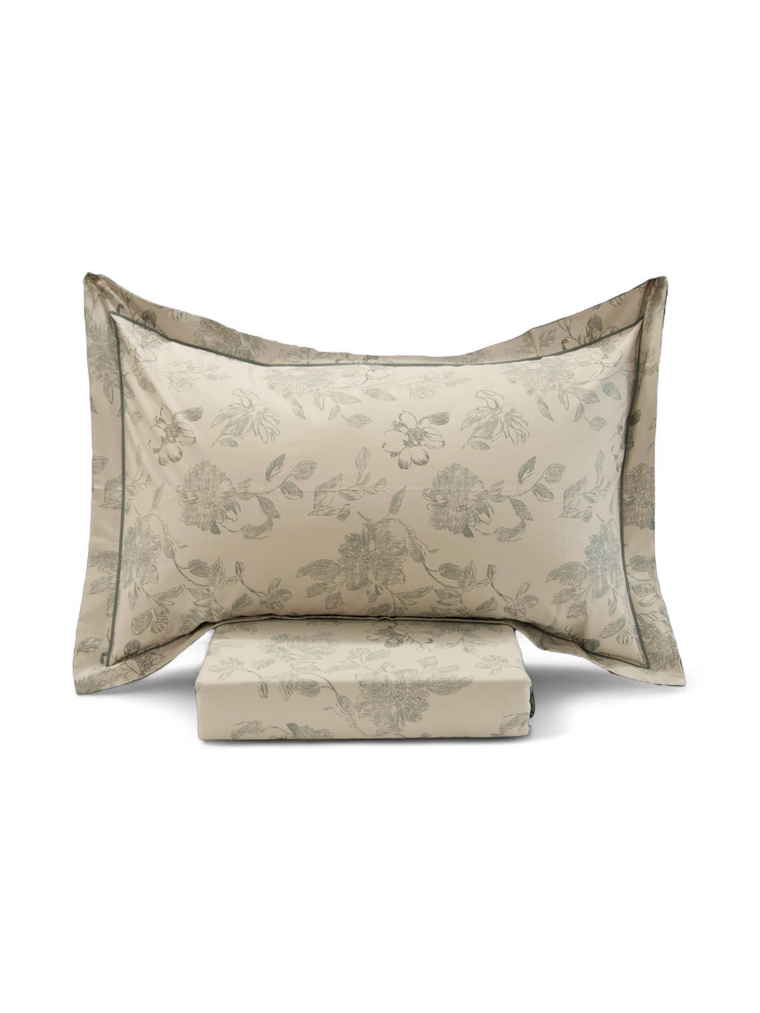 Комплект постельного белья из сатина (100% египетский хлопок). Спокойный серый оттенок и нежный цветочный принт. Наволочки «оксфорд», пододеяльник на скрытом замочке.