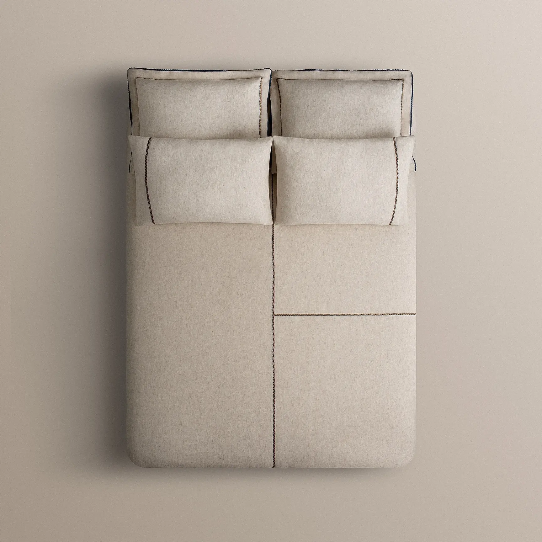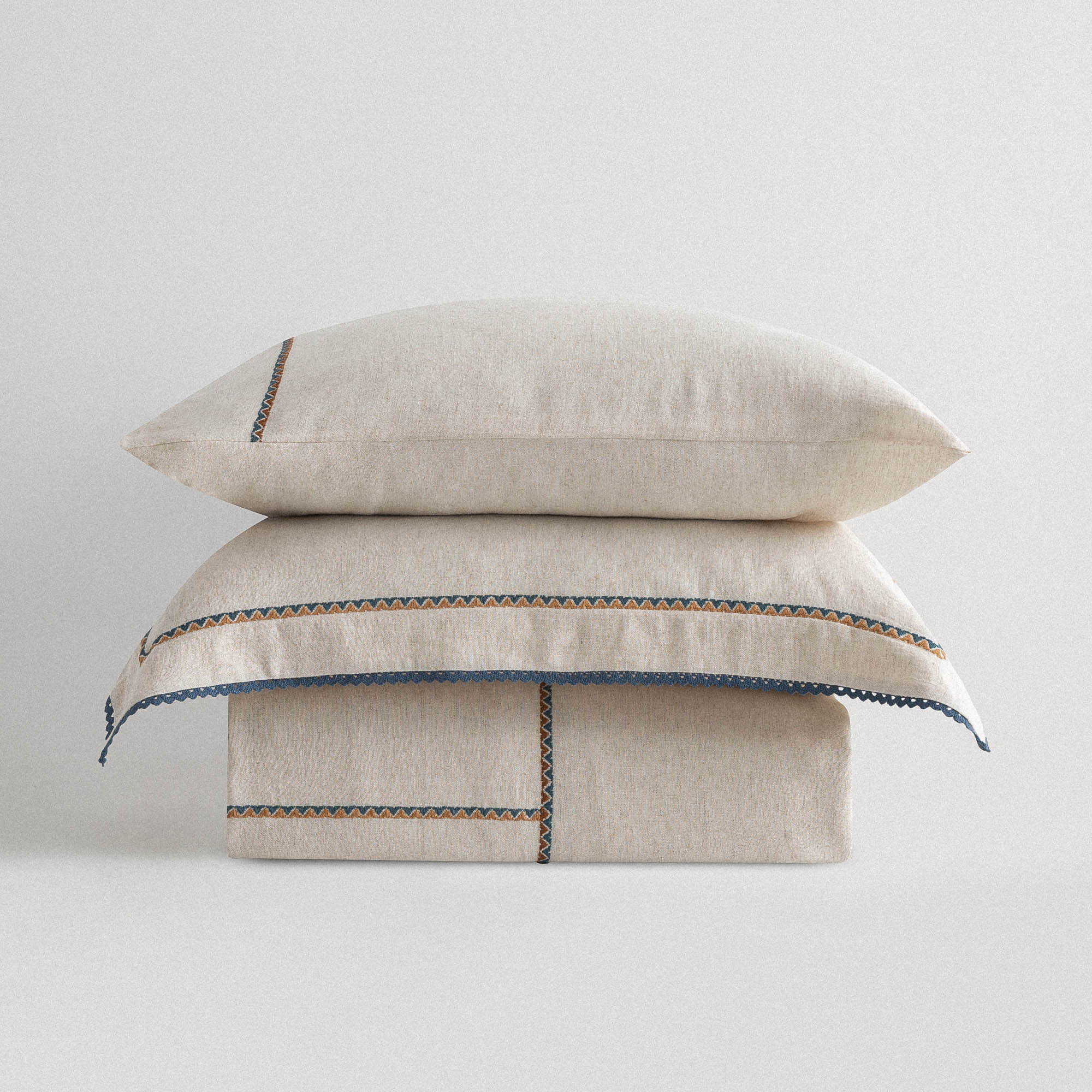 Минималистичный комплект с вышивкой ручной работы. Сатиновое полотно постельного белья выполнено из органического эгейского хлопка — мягкого, дышащего материала с добавлением конопляного волокна. Такой хлопок безопасен для человека и окружающей среды и выдерживает до 400 циклов стирки.