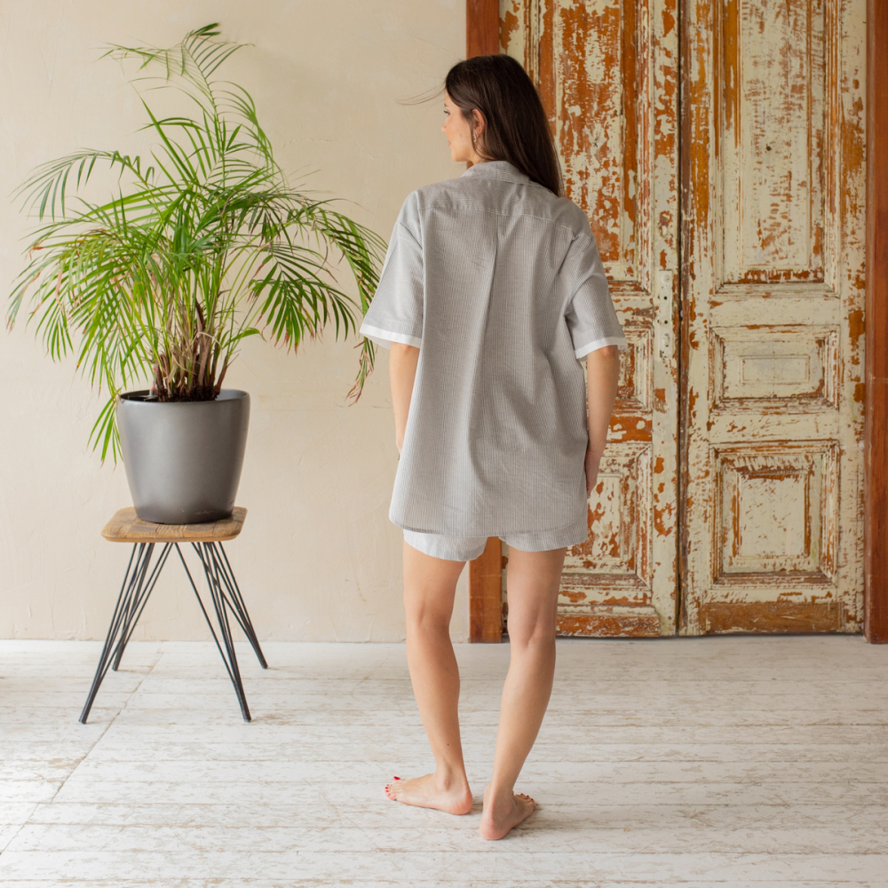 Рубашка из вареного хлопка с коротким рукавом, декорированная контрастной вышивкой на грудном кармане.