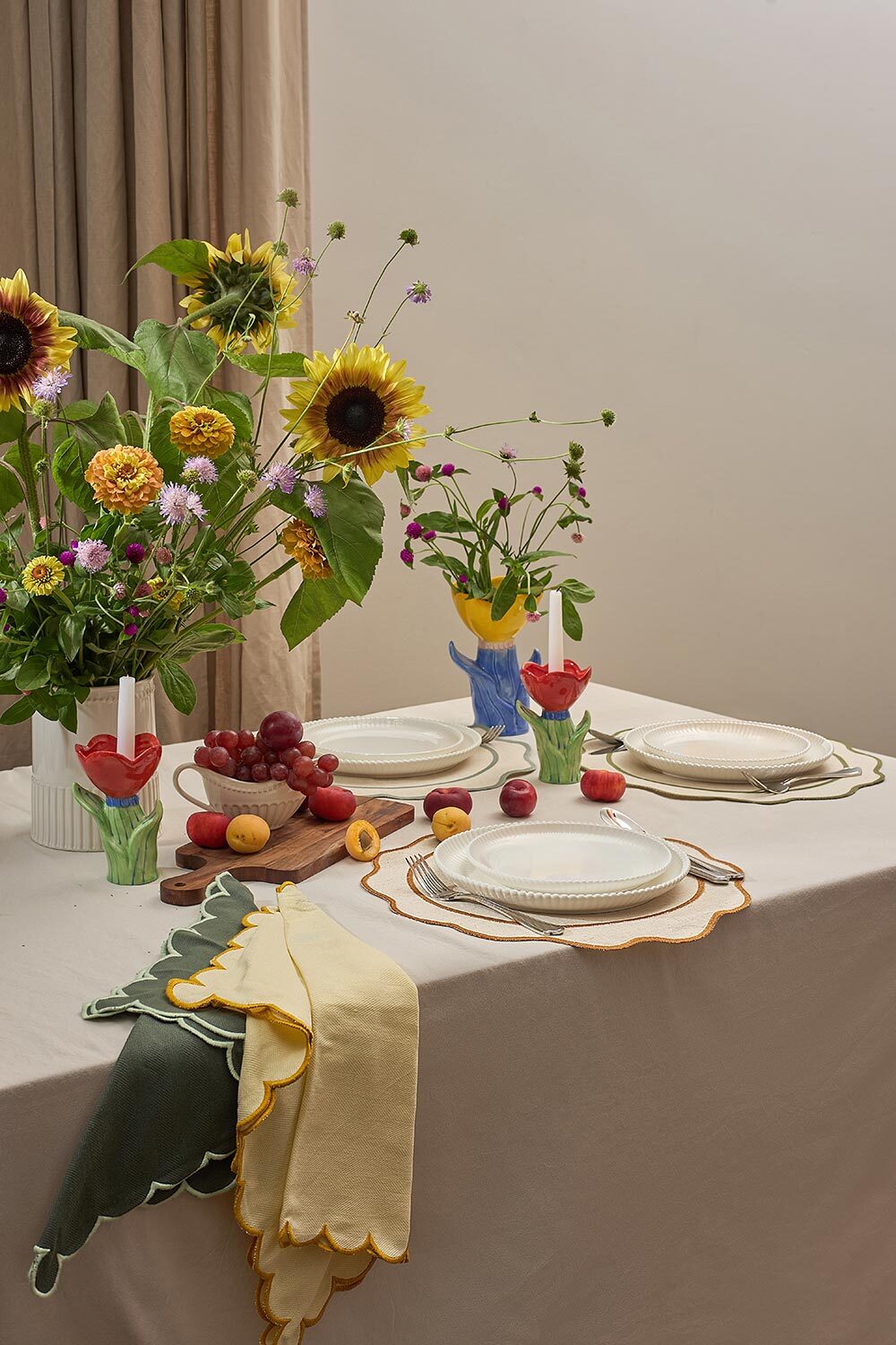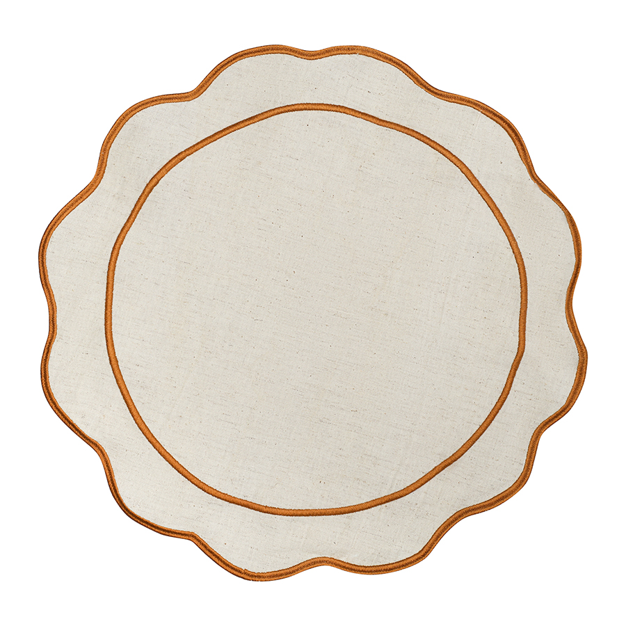 Салфетка под приборы Anemone из коллекции Trendy Ruffles с кантом цвета карри сделает любую сервировку стильной, позволив экспериментировать с текстурами и формами. Текстиль с волнистой отделкой, напоминающей изящные раковины морских гребешков, стал ярким элементом стиля Ар Деко – и сейчас возвращается в моду, появляясь в самых актуальных интерьерных решениях.