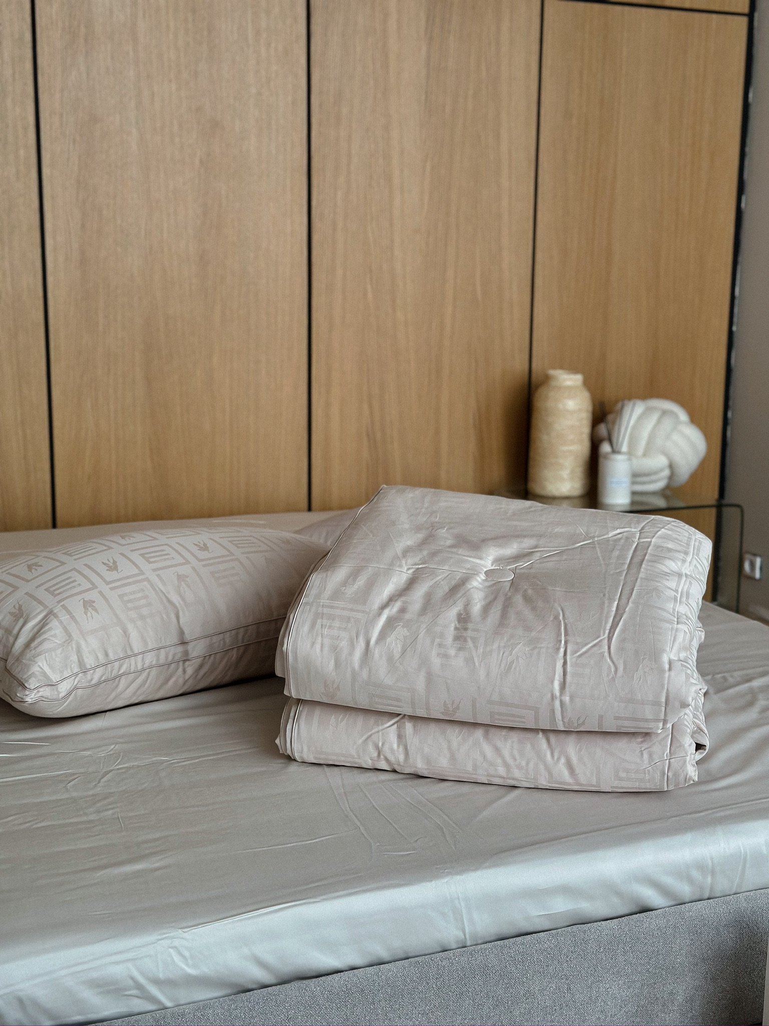 Базовое одеяло с наперником из сатина и наполнителем из шелка и бамбука. Натуральные волокна подвергаются высокотехнологичной обработке, позволяющей получить тончайшие нити.