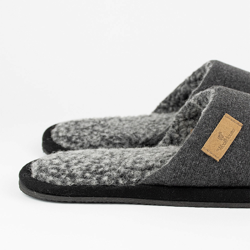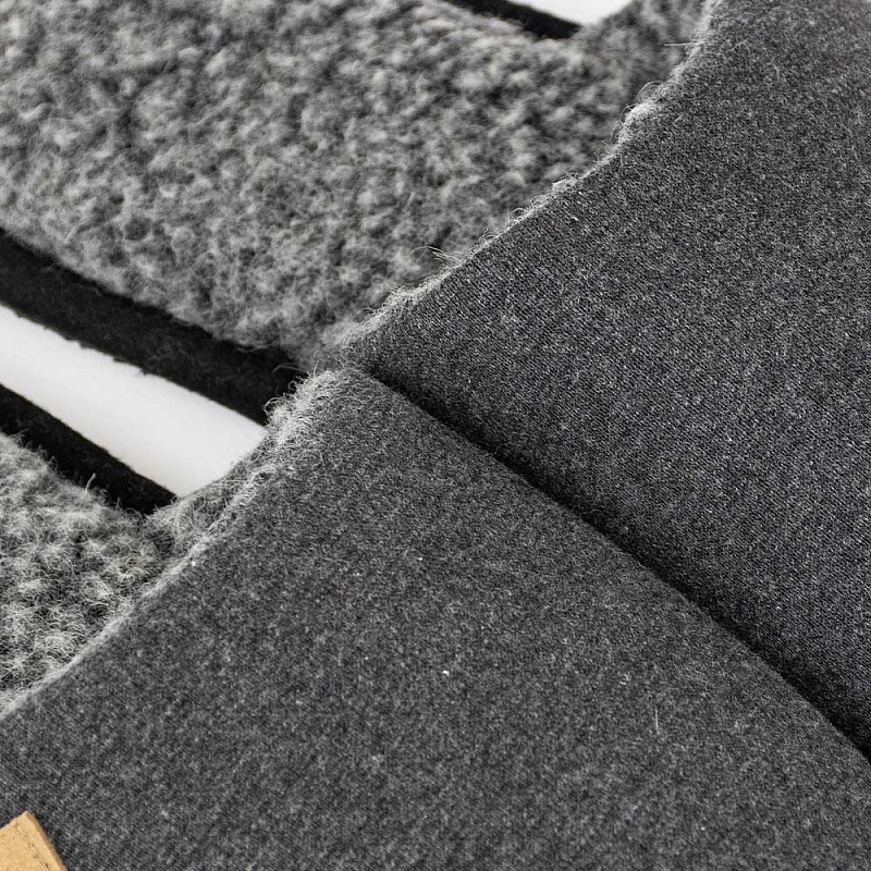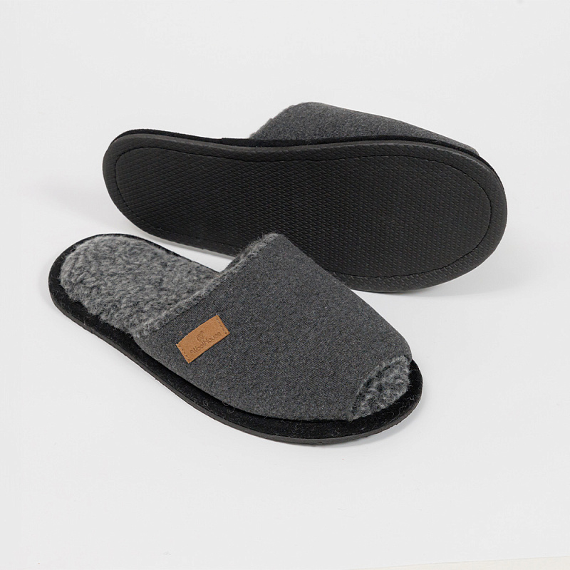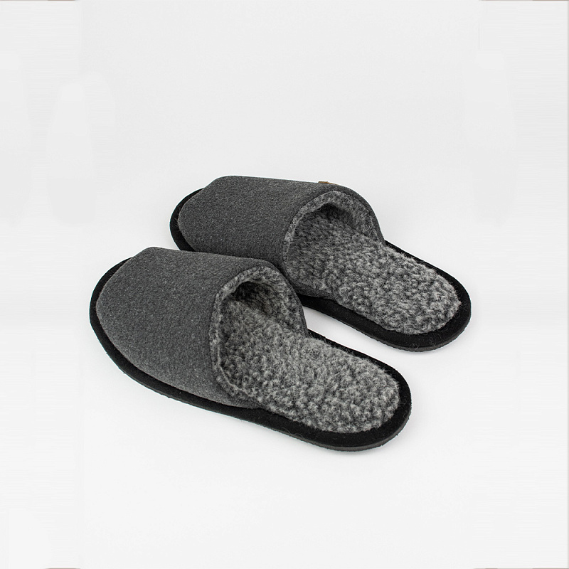 Лаконичные мужские тапочки с двухслойным верхом. Верх выполнен из трикотажного хлопкового полотна, подкладка - из трикотажного полотна с чистошерстяным ворсом, с открытой носовой частью. У тапочек вырубная полимерная подошва с тиснением.