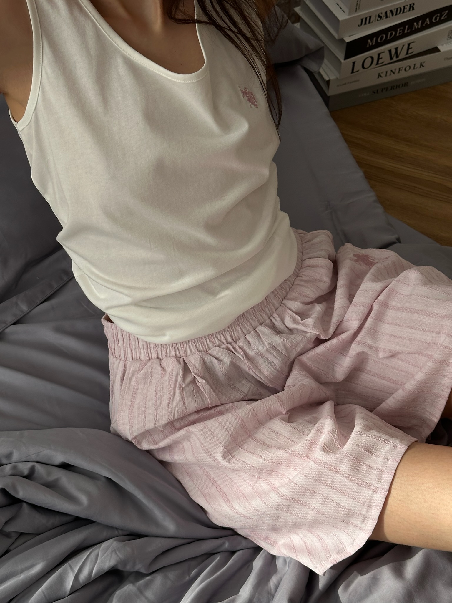 Женский домашний комплект U.S.Polo. Актуальная классическая модель для отдыха дома. Майка базового кроя в белом оттенке. Розовые шорты средней длины из плотной ткани.